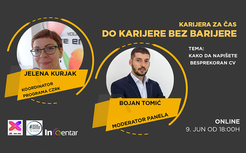 Gost prve sesije panela „Karijera za čas“ biće Jelena Kurjak, koordinator programa Centra za razvoj karijere Univerziteta u Beogradu. Jelena iza sebe ima višegodišnje iskustvo u karijernom savetovanju i stručnoj i profesionalnoj orijentaciji i sa vama će podeliti sve tajne i cake pisanja besprekornog CV-ja. Pridružite nam se, pošaljite nam sva pitanja koja vas interesuju ili ih postavite tokom sesije. Dobro došli!