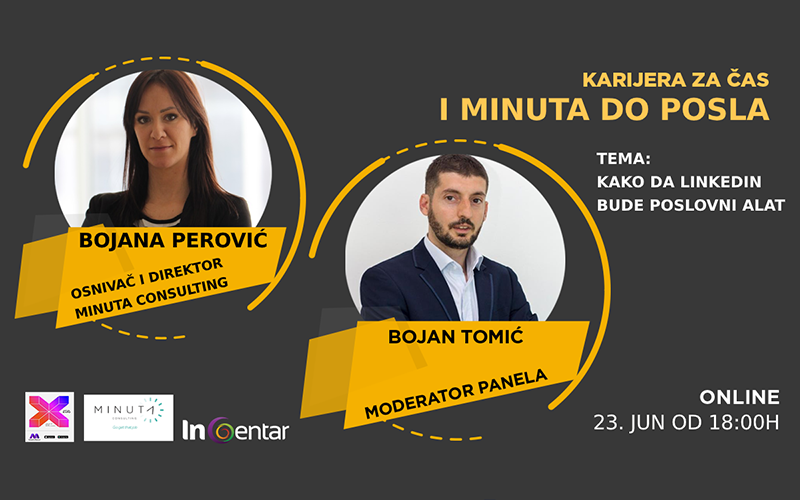Gost treće sesije panela biće Bojana Perović, direktor i osnivač agencije Minuta Consulting. Na ovoj panel sesiji moći ćete da saznate sve što vam treba o efikasnom korišćenju LinkedIn mreže kao alata za umrežavanje i dolazak do najboljih ponuda za posao. Kao ekspert u karijernom savetovanju Bojana će vam pomoći da LinkedIn i portale za zapošljavanje koristite maksimalno efikasno. Dobro došli na našu sesiju!